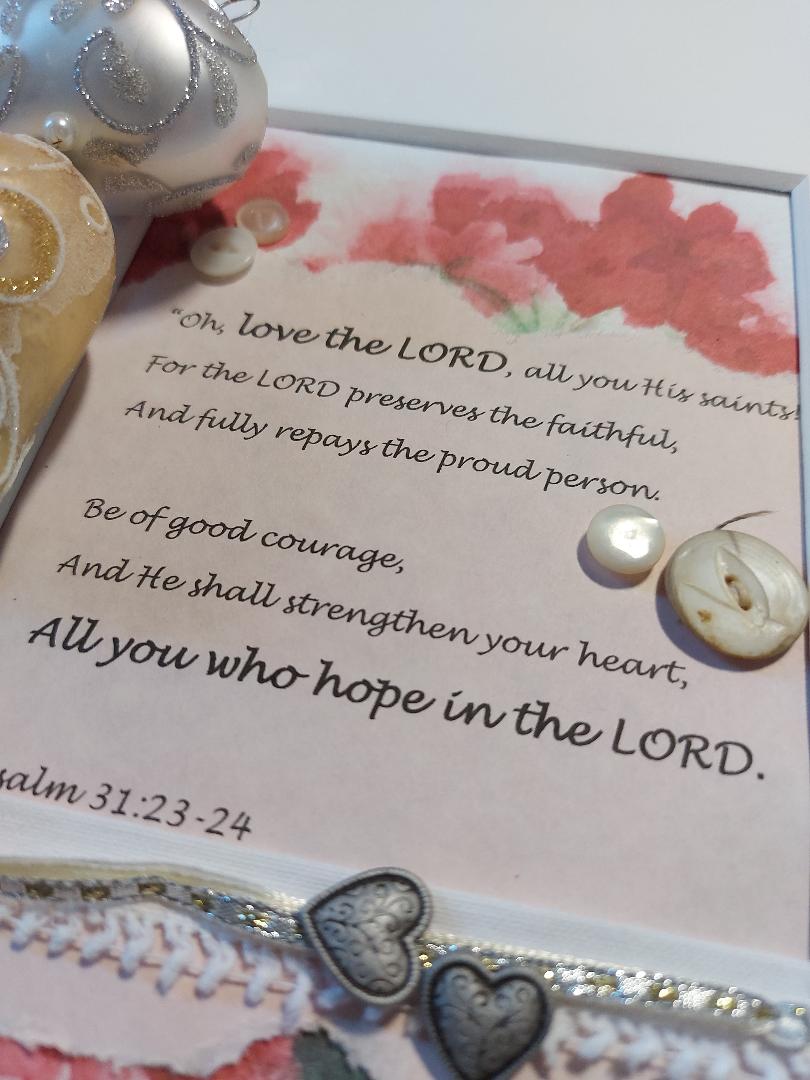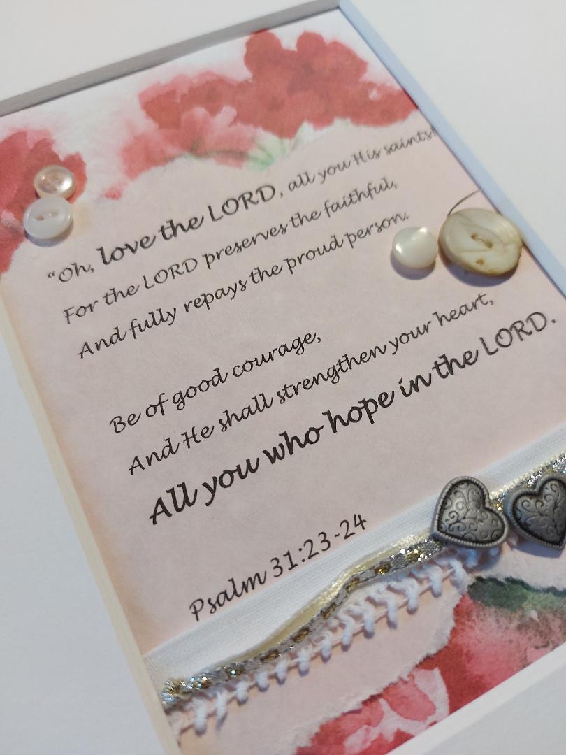 3. Now have fun gluing on scraps of vintage lace, ribbon, buttons or other embellishments, to dress up your page. Use your imagination! Wait for the glue to dry, then mat or frame. Now you’re ready to enjoy this hope-filled reminder from Psalm 31!