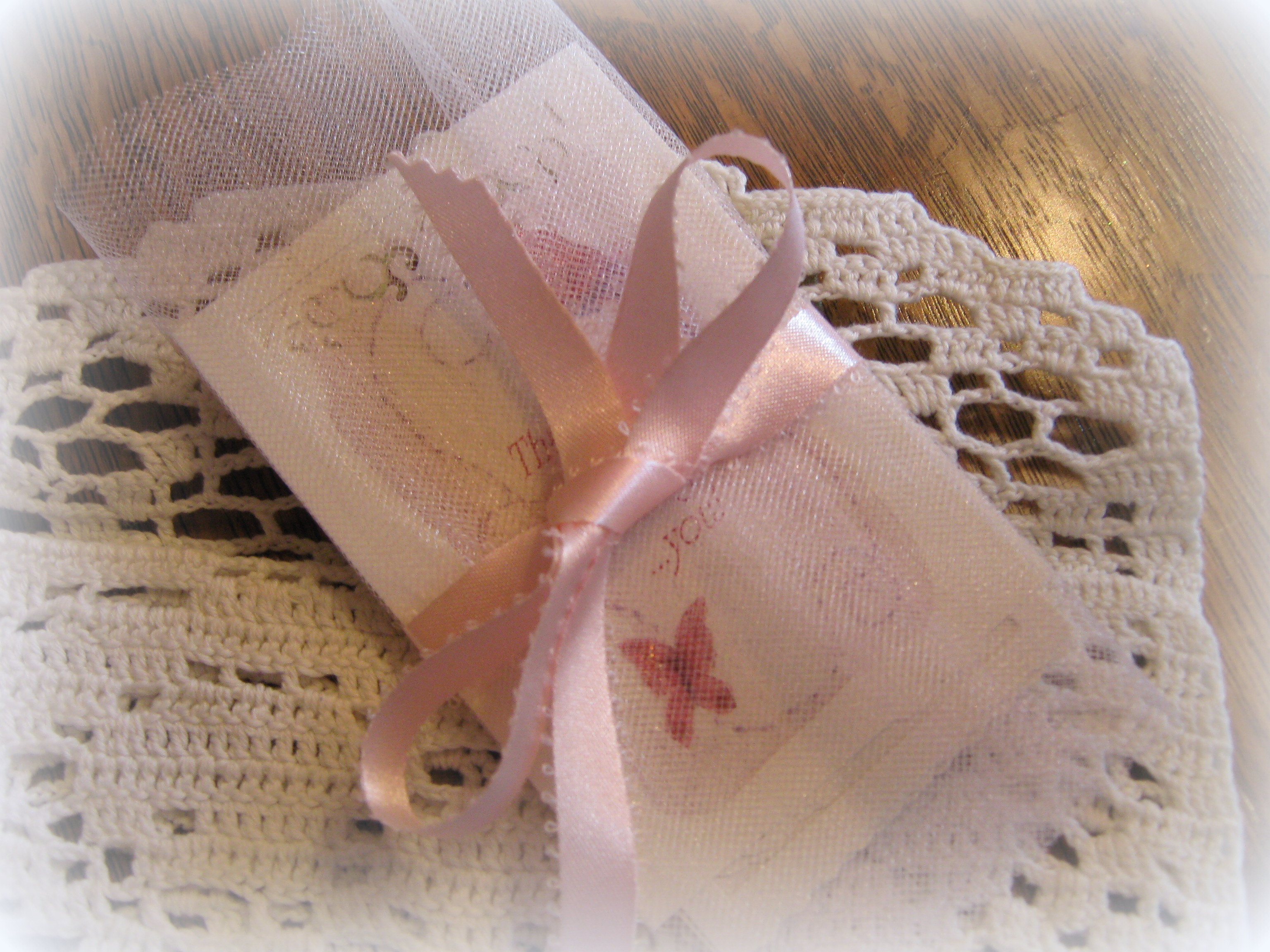 I made a little envelope for the set of minature prints from a vintage, rectangular doilly, that had one end curved slightly. Simply starch and press, then fold into an envelope–close the sides by gluing or sewing–embellish the flap for a pretty touch–and your envelope is ready to nestle your little messages of love and gratitude inside…