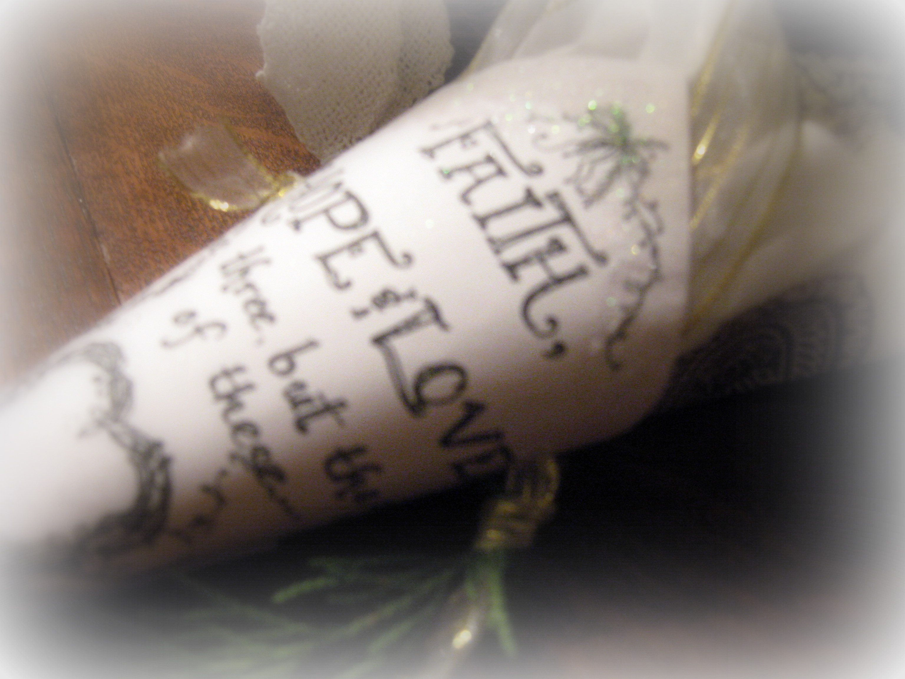 You can simply copy, and then cut the paper to separate each verse, forming strips. I found it worked well to fold each strip in half, gather them all together to form a bundle, then wrap them loosely in a pretty piece of tissue paper, nestling the verses and tissue down inside the paper cone.